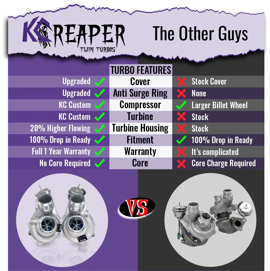 The KC Turbos Reaper 500 Twin Turbos are engineered for enthusiasts seeking to elevate their 2013–2016 F-150 3.5L EcoBoost's performance. With custom-designed compressor and turbine wheels, these turbos are capable of delivering up to 500 wheel horsepower. The upgraded turbine housing and anti-surge rings ensure efficient airflow and reduced turbo lag, making them a direct bolt-on upgrade for those aiming for substantial power gains.